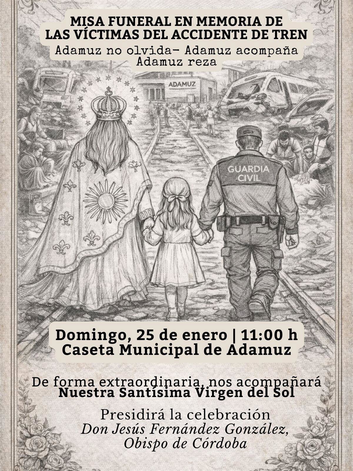 El cartel en el que la Diócesis cordobesa anuncia la citada misa funeral tiene como centro la imagen de la Virgen del Sol, caminando por las vías del tren camino del pueblo de Adamuz, que aparece al fondo, mientras acompaña, cogida de la mano, a una niña pequeña, a quien también sujeta, de su otra mano, un agente de la Guardia Civil. Este conjunto central recorre un camino ferreo flanqueado por los heridos en el accidente y personas que les asisten, junto a restos de los trenes siniestrados.