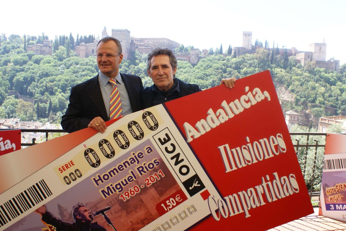La ONCE ha querido sumarse a la despedida de Miguel Ríos de los escenarios llevando su imagen, con el fondo de la Alhambra, y la leyenda 'Hasta siempre Miguel' a cinco millones de cupones que ya están a la venta para el sorteo del martes 3 de mayo. Serán "cinco millones de aplausos en forma de cupón, de reconocimiento, de admiración y de gratitud por habernos querido tanto", según ha dicho el delegado territorial de la ONCE en Andalucía, Patricio Cárceles en la presentación del cupón, celebrada en el Carmen de las Tomasas frente a la Alhambra.