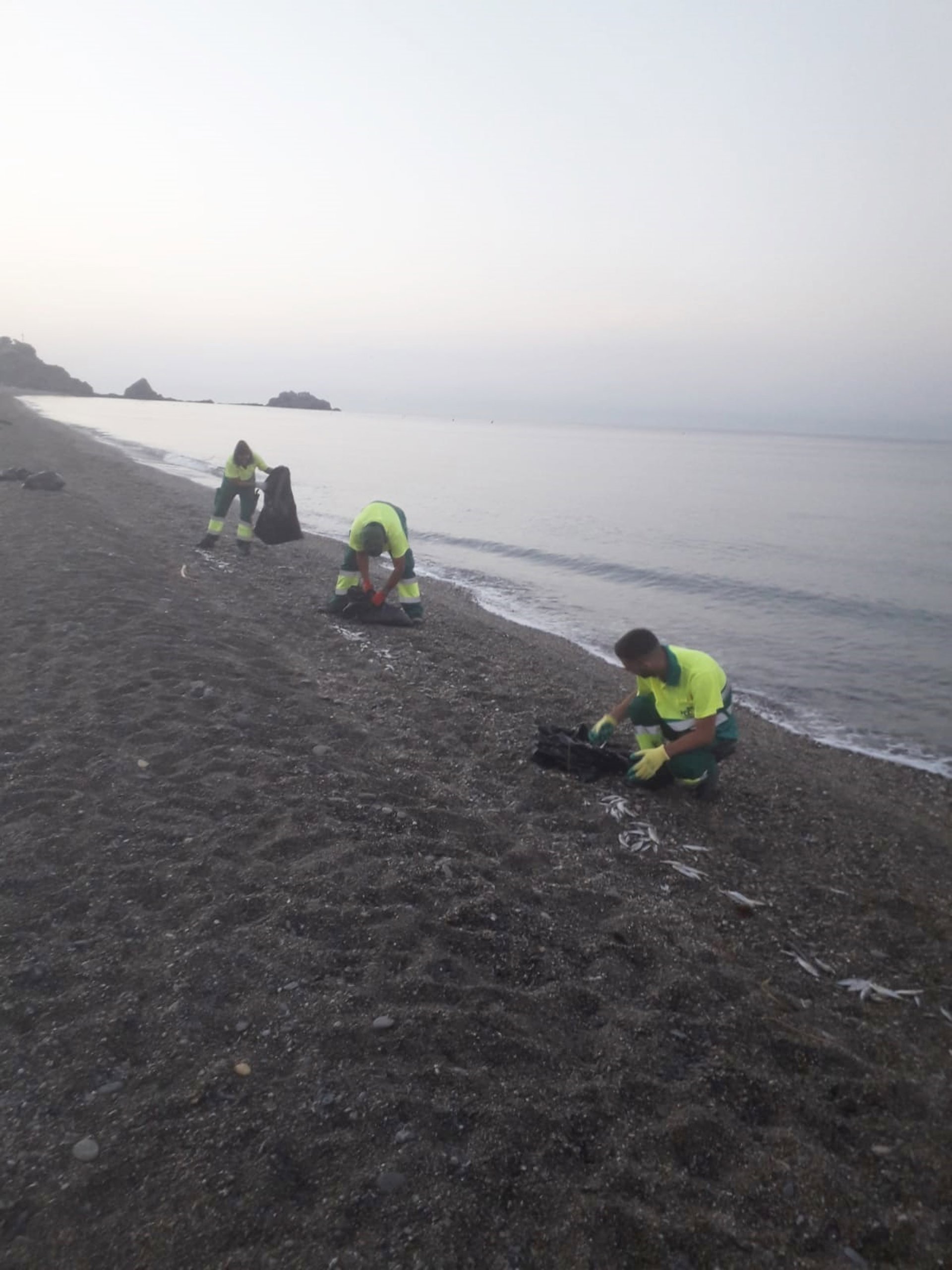 Unos 300 kilos de peces muertos han sido retirados por operarios del servicio de limpieza del rebalaje de la playa de San Cristóbal de Almuñécar, en la costa de Granada, en la últimos dos días, que podrían ser parte de un "vertido".