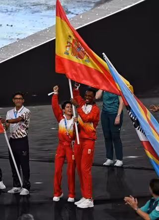 Los atletas María Pérez y Jordan Díaz ejercieron este pasado domingo de abanderados del equipo español en la ceremonia de clausura de los Juegos Olímpicos de París 2024 - COE