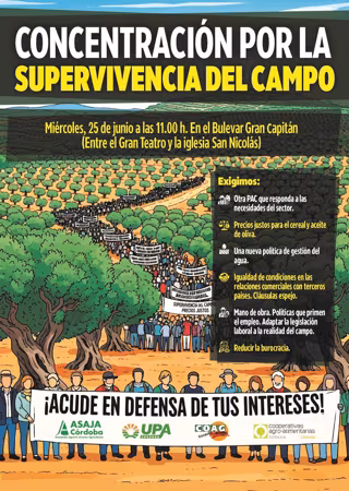 Cartel de la concentración de las organizaciones agrarias Asaja, COAG, UPA y Cooperativas Agro-Alimentarias, convocada para el miércoles 25 de junio en el Bulevar Gran Capitán de Córdoba por la supervivencia del campo. - ASAJA