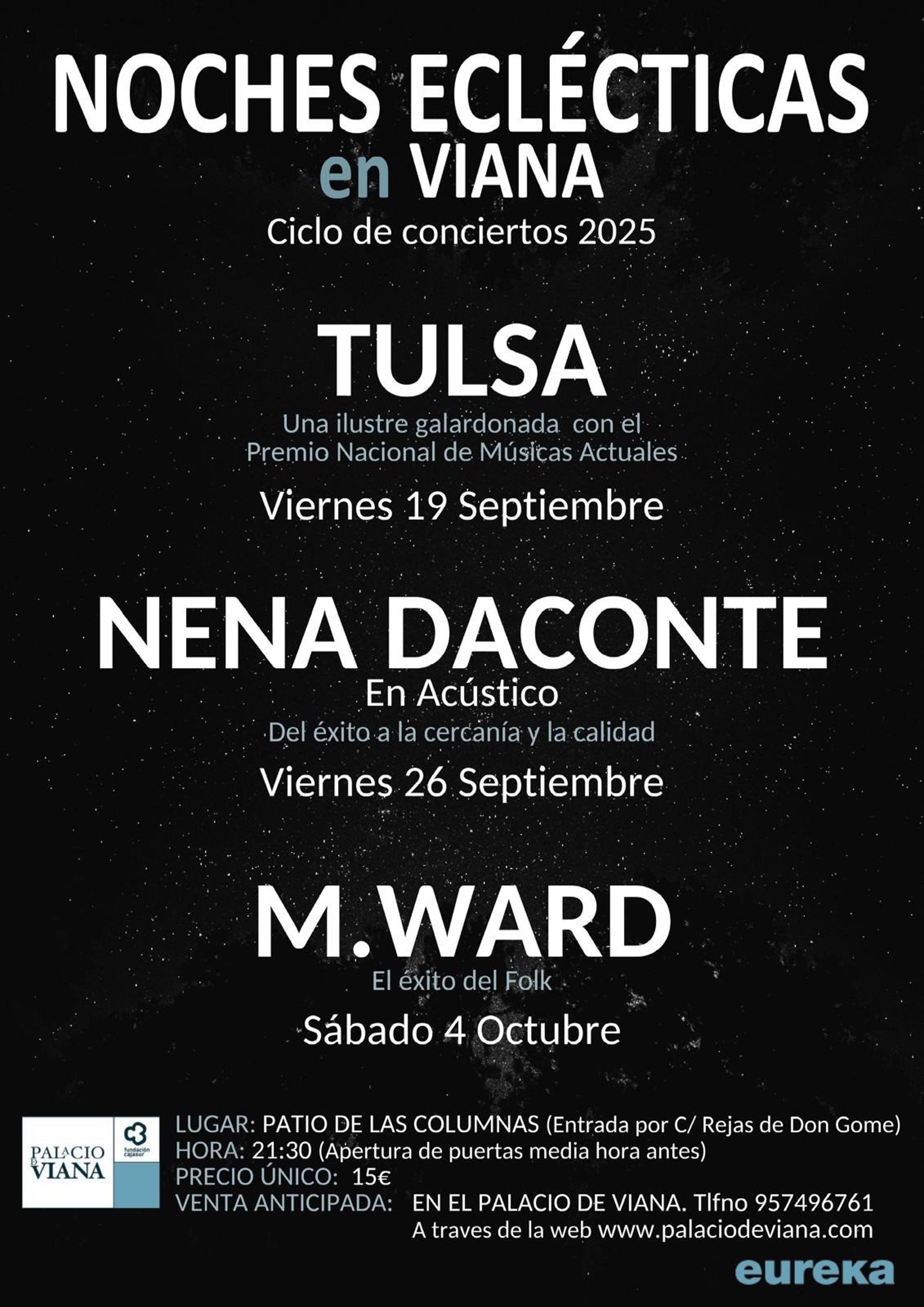 El área cultural de la Fundación Cajasur, junto al productor Fernando Vacas, han programado tres conciertos dentro del tradicional ciclo de 'Noches eclécticas' para los días 19 y 26 de septiembre y 4 de octubre en el patio de Columnas del Palacio de Viana, con comienzo a las 21,30 horas.