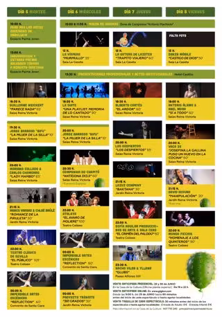 Así lo indicó en su momento la organización en una nota en la que detalló que con la incorporación de los espectáculos de Proyecto Tránsito ('361 grados'), La Gotera de la Azotea ('Trapito viajero'), Lazuz Company ('Baktana'), Yllana & Nacho Vilar ('Glubs'), Antonio Álamo & Abel Mora ('Sí, a todo'), Vaca 35 ('Josefina la gallina puso un huevo en la cocina') y Varuma ('La mujer sentada') se completa una programación que se clausurará con el montaje 'Homenaje a los Quintero' de la compañía Mundo Ficción, integrada por Alfonso Sánchez y Alberto López.