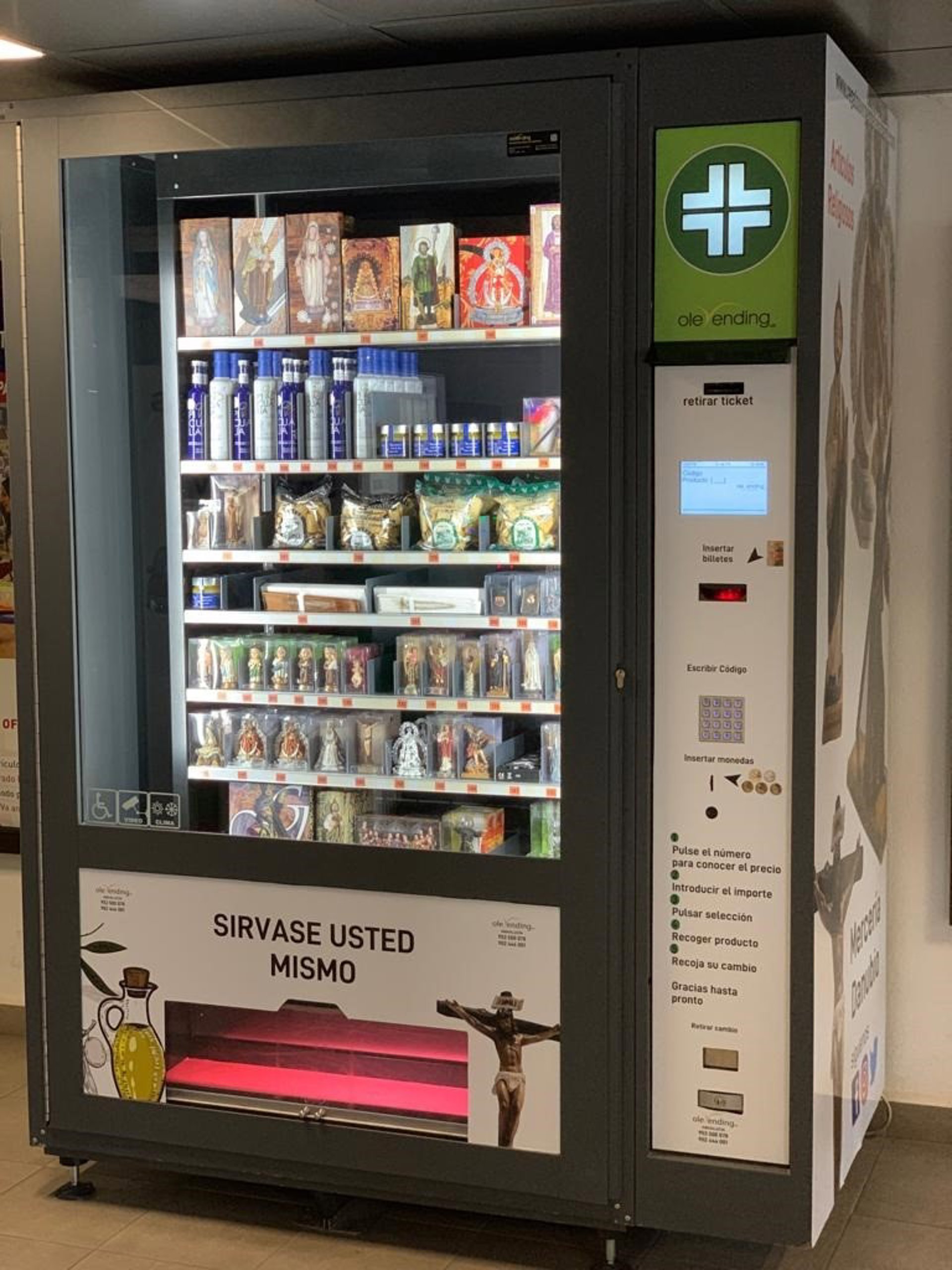 El aparcamiento público de Linares (Jaén) situado junto al Ayuntamiento ha instalado la primera máquina expendedora de España de artículos religiosos de España, una iniciativa que ha partido de Rafael Calzado, un empresario de Andújar (Jaén) que ha visto en esta iniciativa un hueco de negocio terrenal aún sin explotar.