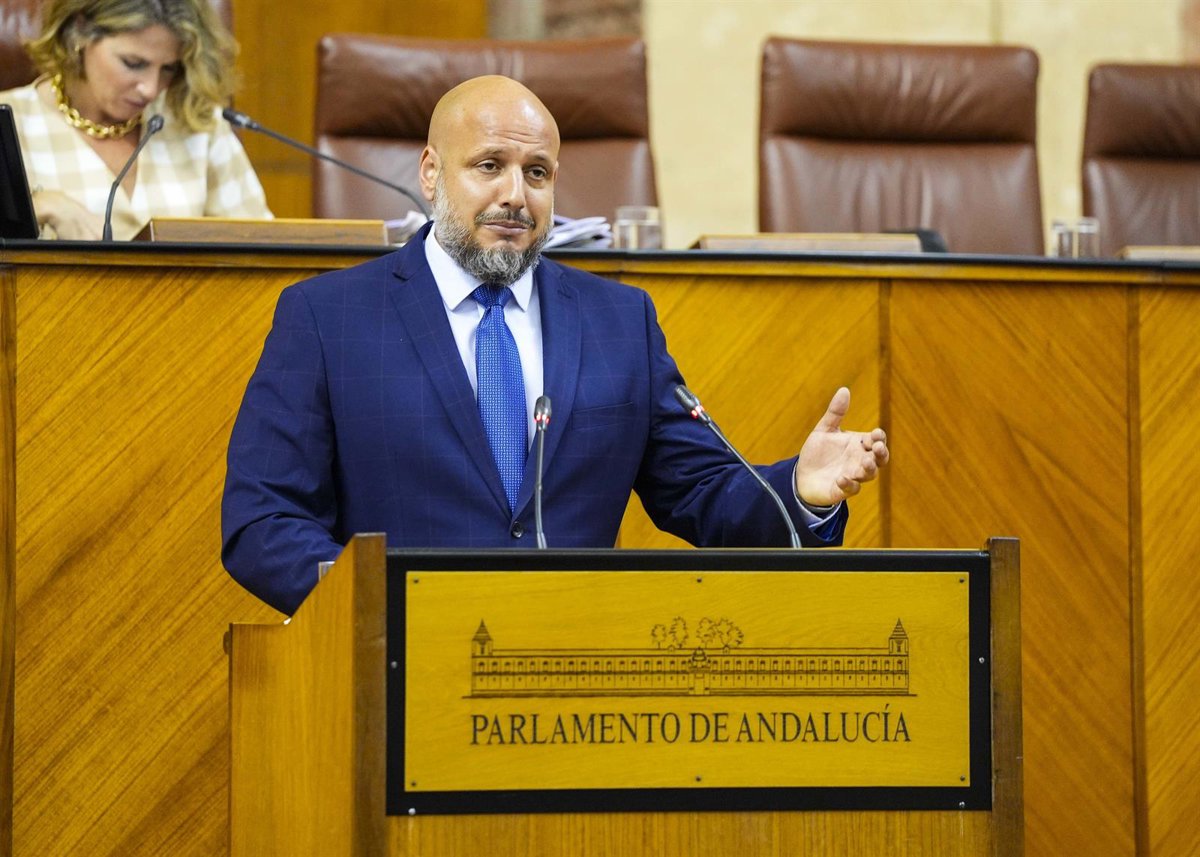 El portavoz adjunto del Grupo Vox en Andalucía, Rodrigo Alonso, este miércoles en el Pleno del Parlamento en defensa de la PNL sobre el sector primario. - JOAQUÍN CORCHERO/PARLAMENTO DE ANDALUCÍA