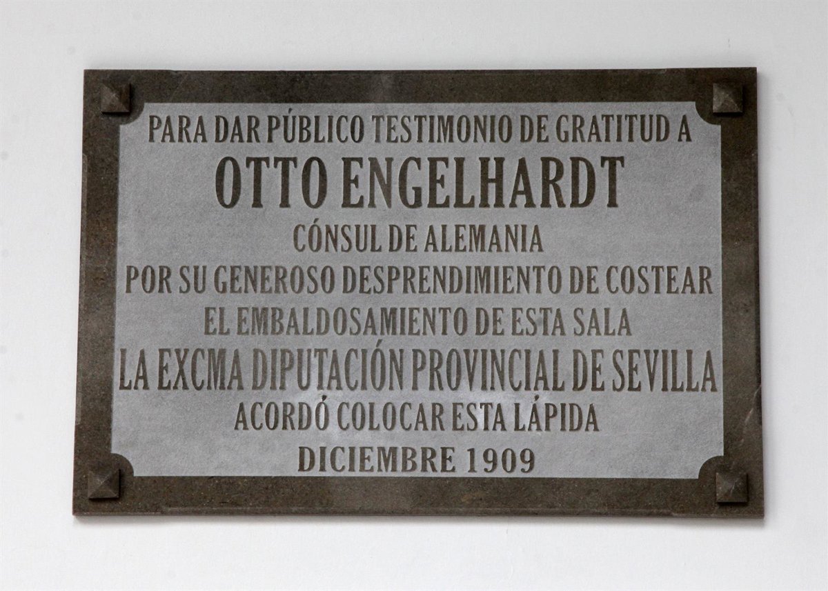 La placa de reconocimiento a Otto Engelhardt, que se ha instalado en el 'Patio del Alcohol' del Parlamento de Andalucía por su cercanía a la ubicación original, es una réplica exacta a la original que se colocó en el año 1909 en la 'Sala San José' del antiguo Hospital de las Cinco Llagas y que fue destruida posteriormente.