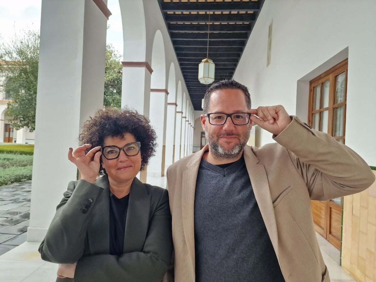 Los diputados de Adelante Andalucía, Maribel Mora y José Ignacio García, exhiben sus gafas este martes en los pasillos del Parlamento de Andalucía. - ADELANTE ANDALUCÍA