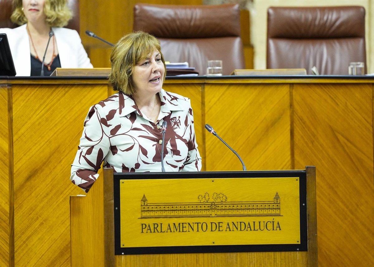 La diputada de Vox Cristina Jiménez, este jueves en el Pleno del Parlamento en la defensa de la PNL. - JOAQUÍN CORCHERO/PARLAMENTO DE ANDALUCÍA