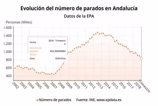 Andalucía ha liderado en España la caída del paro en términos absolutos con 126.200 desempleados menos en 2018, lo que supone un 13,14 por ciento menos que el año anterior, y también la creación de empleo con 118.600 ocupados más, según los datos de la Encuesta de Población Activa (EPA) correspondientes al cuarto trimestre hechos públicos este martes por el Instituto Nacional de Estadística (INE).
