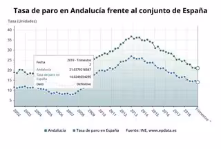 La tasa de paro andaluza del 21,04 por ciento es 7,02 puntos superior a la nacional (14,02%). La tasa de desempleo femenina es 7,41 puntos mayor que la masculina en Andalucía. De esta forma, la tasa de paro masculina se sitúa en Andalucía en el 17,67 por ciento, 5,18 puntos por encima de la media nacional, que es del 12,49 por ciento; mientras que la tasa de paro femenino es del 25,08 por ciento, 9,3 puntos más que la media del país (15,78 por ciento).