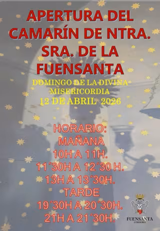 El próximo domingo 12 de abril, II de Pascua y de la Divina Misericordia, el camarín de Nuestra Señora de la Fuensanta, patrona coronada de Córdoba, se abrirá para la veneración de los fieles, en horario de mañana y tarde, antes y después de cada misa del Santuario.