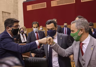 Archivo - El presidente de la Junta de Andalucía, Juanma Moreno (c), y el vicepresidente de la Junta, Juan Marín (i) saludan al consejero de Hacienda, Juan Bravo (d), tras la aprobación de los presupuestos en la segunda jornada del debate final del proy - María José López - Europa Press - Archivo
