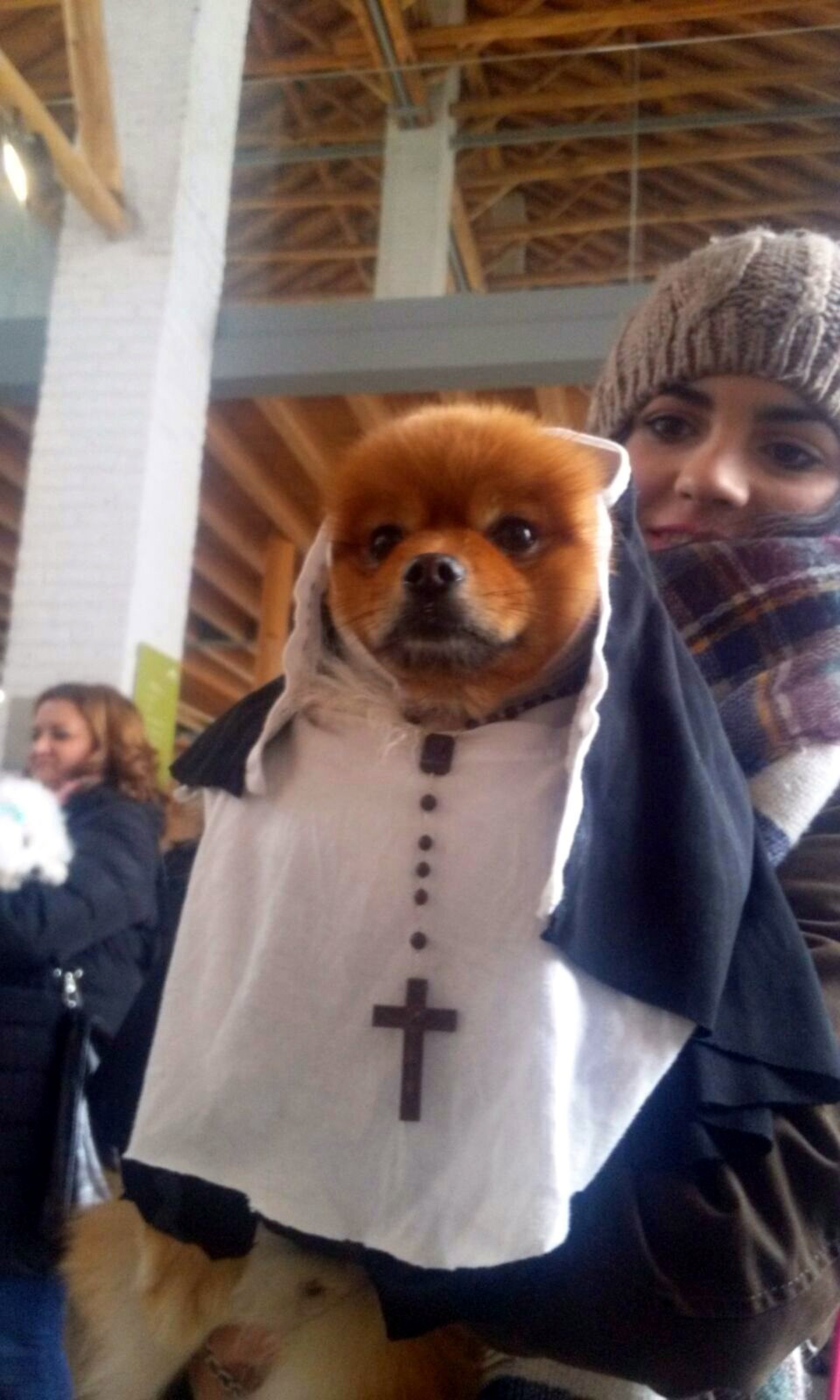 El perro Leo, disfrazado de monja, ha sido el ganador del I Concurso de Disfraces para Mascotas organizado este domingo por el Ayuntamiento de la localidad granadina de Vegas del Genil, en el que han participado un total de 20 canes del municipio, y que ha tenido lugar en el Centro de Interpretación de la Vega.