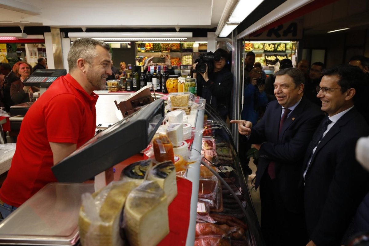 Luis Planas y Francisco Cuenca, a la derecha en la imagen, conversan con un comerciante de Merca80 en Granada - ÁLEX CÁMARA - EUROPA PRESS