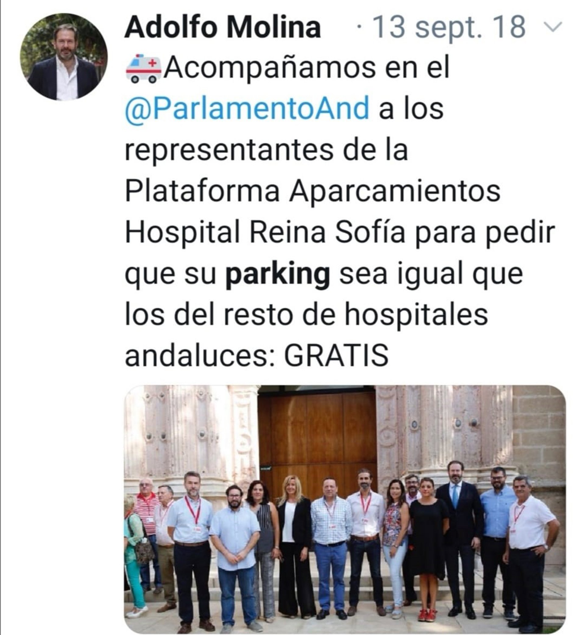 En este sentido y en un comunicado, el colectivo ha recordado que "el 13 de septiembre de 2018, Molina, ya en calidad de presidente del PP de Córdoba y parlamentario en Andalucía, publicaba en redes sociales una defensa de dicha gratuidad con un mensaje que decía: "Acompañamos en el @ParlamentoAnd a los representantes de la plataforma aparcamientos Hospital Reina Sofía para pedir que su parking sea igual que los del resto de los hospitales andaluces: GRATIS".
