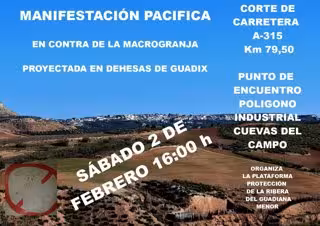 La Plataforma por la Protección del Guadiana Menor ha anunciado para este sábado el corte de la carretera A-315, a la altura del kilómetro 79,5, situado en la rotonda de acceso al polígono industrial de Cuevas del Campo, en contra del proyecto de construcción de la macrogranja de engorde de cerdos más grande de España en Dehesas de Guadix, en el norte de la provincia de Granada.