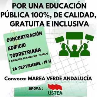 La plataforma ciudadana en defensa de la educación pública, Marea Verde Andalucía, ha convocado para este jueves, a las 19,00 horas, una concentración en el edificio Torretriana, en el Parque Tecnológico y Científico Cartuja y sede de la Consejería de Desarrollo Educativo y Formación Profesional de la Junta de Andalucía, para reclamar una veintena de medidas de mejora entre las que figuran la bajada de la ratio, la mejora de la atención a la diversidad, la puesta en marcha de la Ley de Bioclimatización y la eliminación de las pruebas diagnóstico, entre otras.