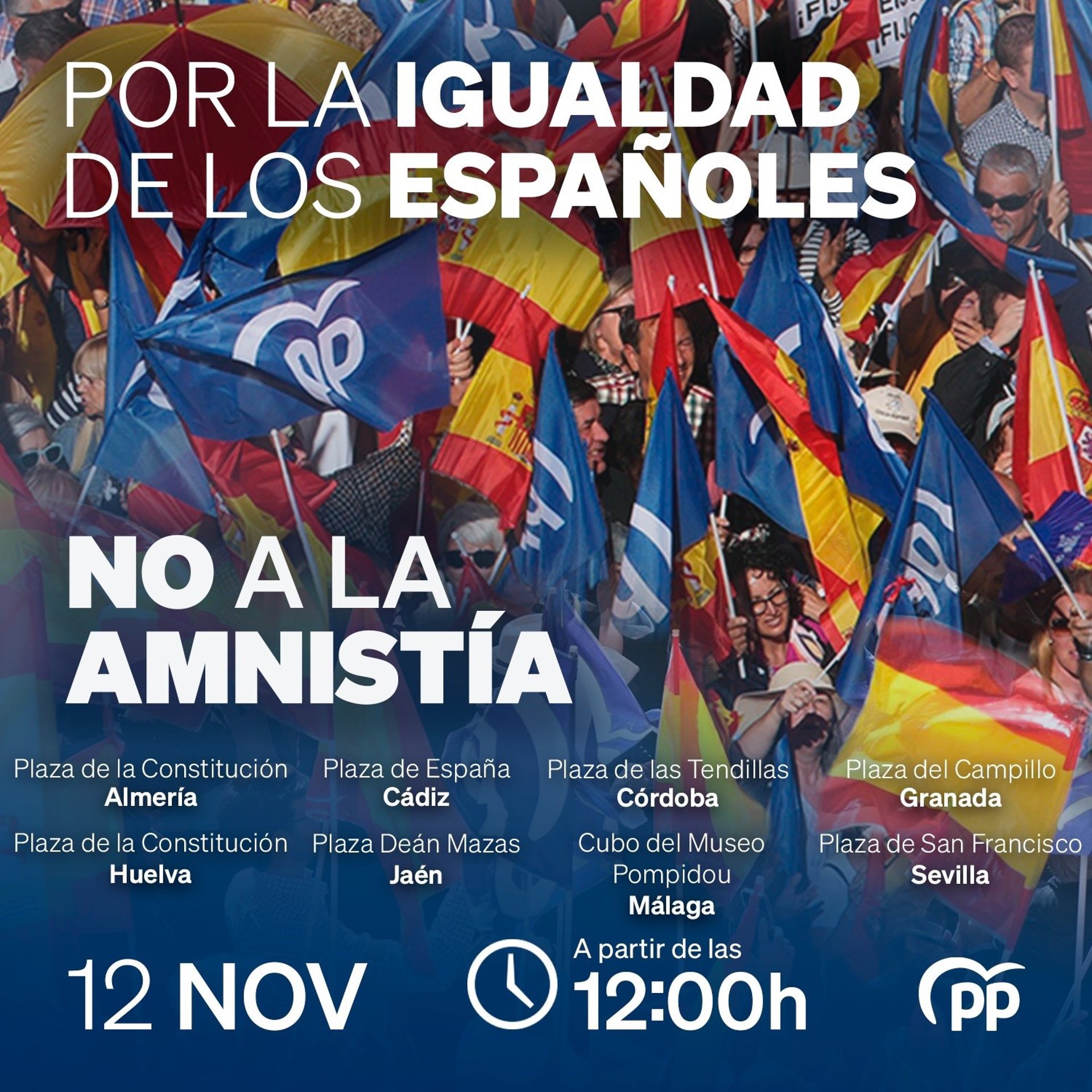 El PP andaluz ha convocado este domingo día 12 concentraciones en las ocho capitales de provincia en contra de la amnistía al 'procés' y en defensa de la iguladad entre todos los españoles.