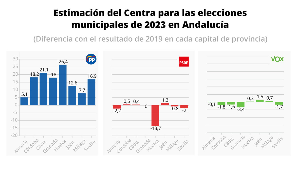 De acuerdo al apartado de estimación de voto de dicha encuesta, el PP revalidaría las tres capitales andaluzas en las que actualmente gobierna, pero mejoraría sus resultados, ya que en esta ocasión lograría la mayoría absoluta en Almería --con 14-15 concejales--; Córdoba --con 15-16 ediles-- y Málaga, con 16-17 representantes en el Ayuntamiento.