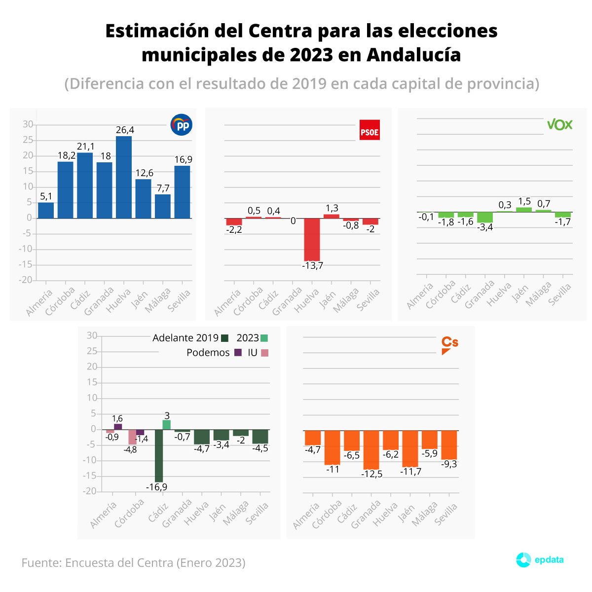 Por su parte, el PSOE sería la segunda fuerza más votada en todas las capitales andaluzas salvo en Cádiz, donde Adelante Cádiz sería el segundo partido más votado, por delante de los socialistas.