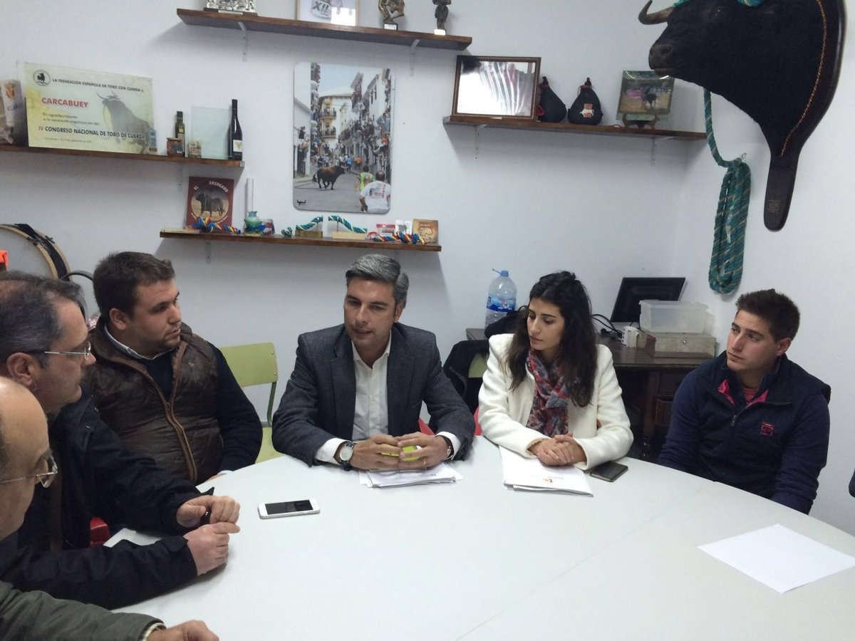 El portavoz del Grupo Popular en la Diputación de Córdoba, Andrés Lorite, acompañado de la diputada provincial del PP, Carmen María Arcos, y el portavoz popular en el Ayuntamiento de Carcabuey (Córdoba), José Marín, ha presentado a miembros de la junta directiva de la Asociación del Toro de Cuerda de Carcabuey la moción que presentará el PP en todos los ayuntamientos de la provincia en defensa de la tauromaquia, como "patrimonio cultural".