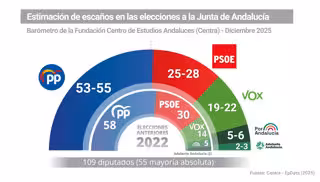 Traducido en escaños, este barómetro asigna entre 53 y 55 al PP-A en el Parlamento andaluz, frente a los 58 que tiene en la actualidad, y cuando la mayoría absoluta se alcanza con 55 diputados en la Cámara autonómica, mientras que el PSOE-A liderado por María Jesús Montero bajaría de sus actuales 30 diputados hasta quedarse con una horquilla de 25-28, lo que sería el peor resultado histórico de los socialistas en elecciones autonómicas.