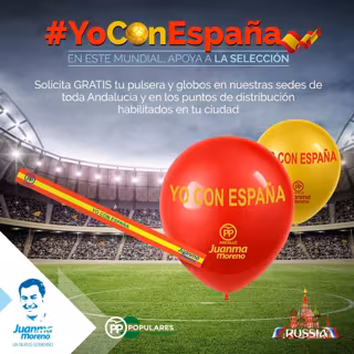 El PP andaluz ha puesto en marcha una iniciativa para repartir, de forma gratuita, pulseras y globos con los que los aficionados al fútbol puedan animar y "apoyar a España" en su participación en el Mundial de Rusia 2018, que arrancó este jueves y en el que este viernes se estrena la selección nacional con un partido ante Portugal.