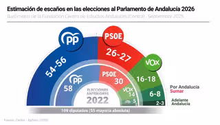 Traducido en escaños, este resultado arrojaría entre 54 y 56 escaños para el PP-A en el Parlamento andaluz, frente a los 58 que tiene en la actualidad, y cuando la mayoría absoluta se alcanza con 55 diputados en la Cámara autonómica, mientras que el PSOE-A liderado por María Jesús Montero bajaría de sus actuales 30 diputados hasta quedarse con una horquilla de 26 a 29, lo que sería el peor resultado histórico de los socialistas en elecciones autonómicas.