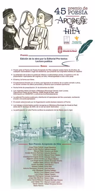 El área de Cultura ha convocado el 45 Premio de Poesía Arcipreste de Hita, una nueva edición del certamen de poesía joven en el que el ganador podrá ver publicada su obra en la editorial Pre-textos, que distribuirá 1.000 ejemplares.