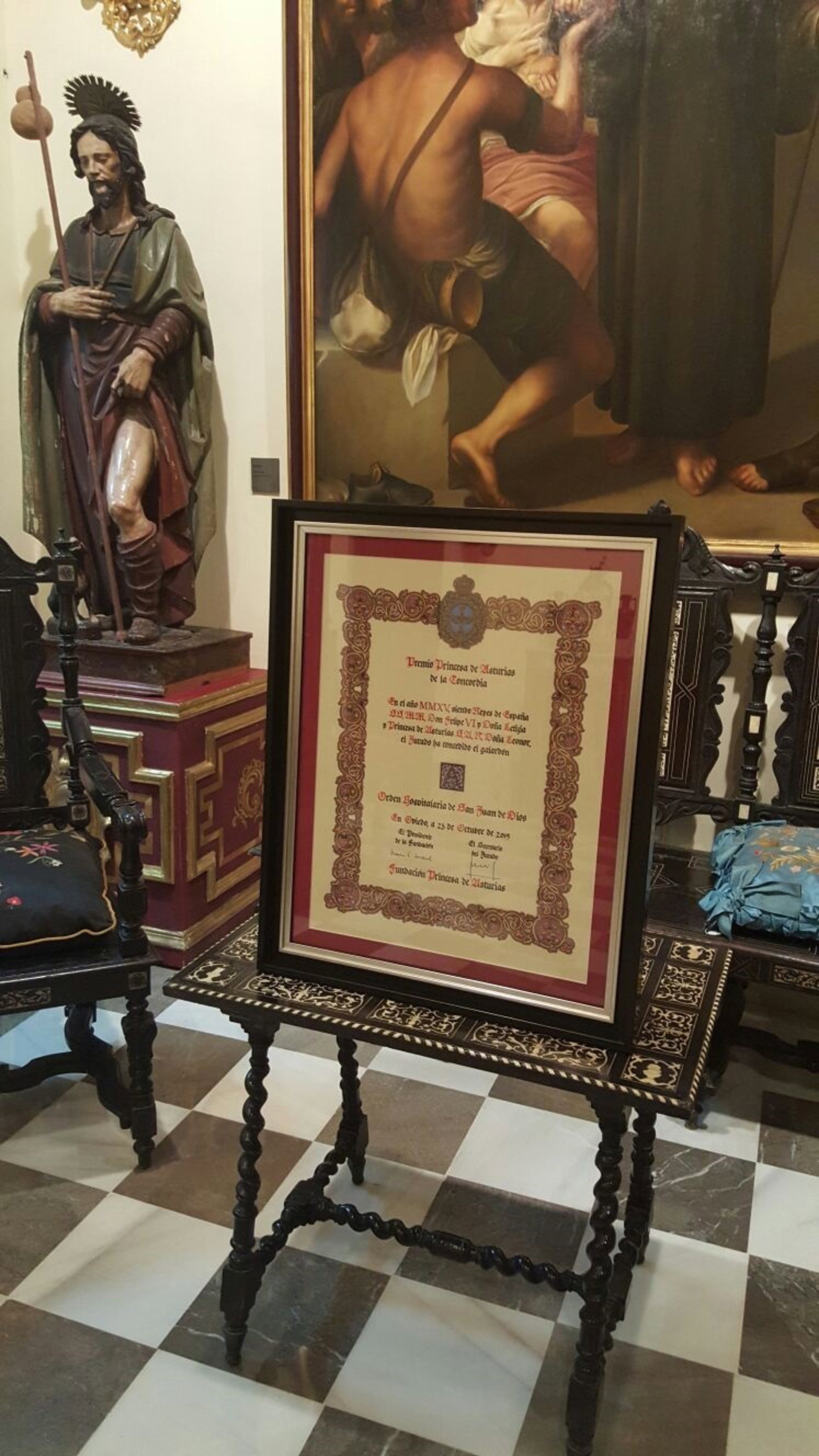El pergamino que certifica la concesión del Premio Princesa de Asturias de la Concordia 2015 a la Orden Hospitalaria de San Juan de Dios, y que entregó el Rey Felipe al Superior General, Jesús Etayo O.H., ha llegado a Granada donde permanecerá expuesto en el Archivo Museo Casa de los Pisa.