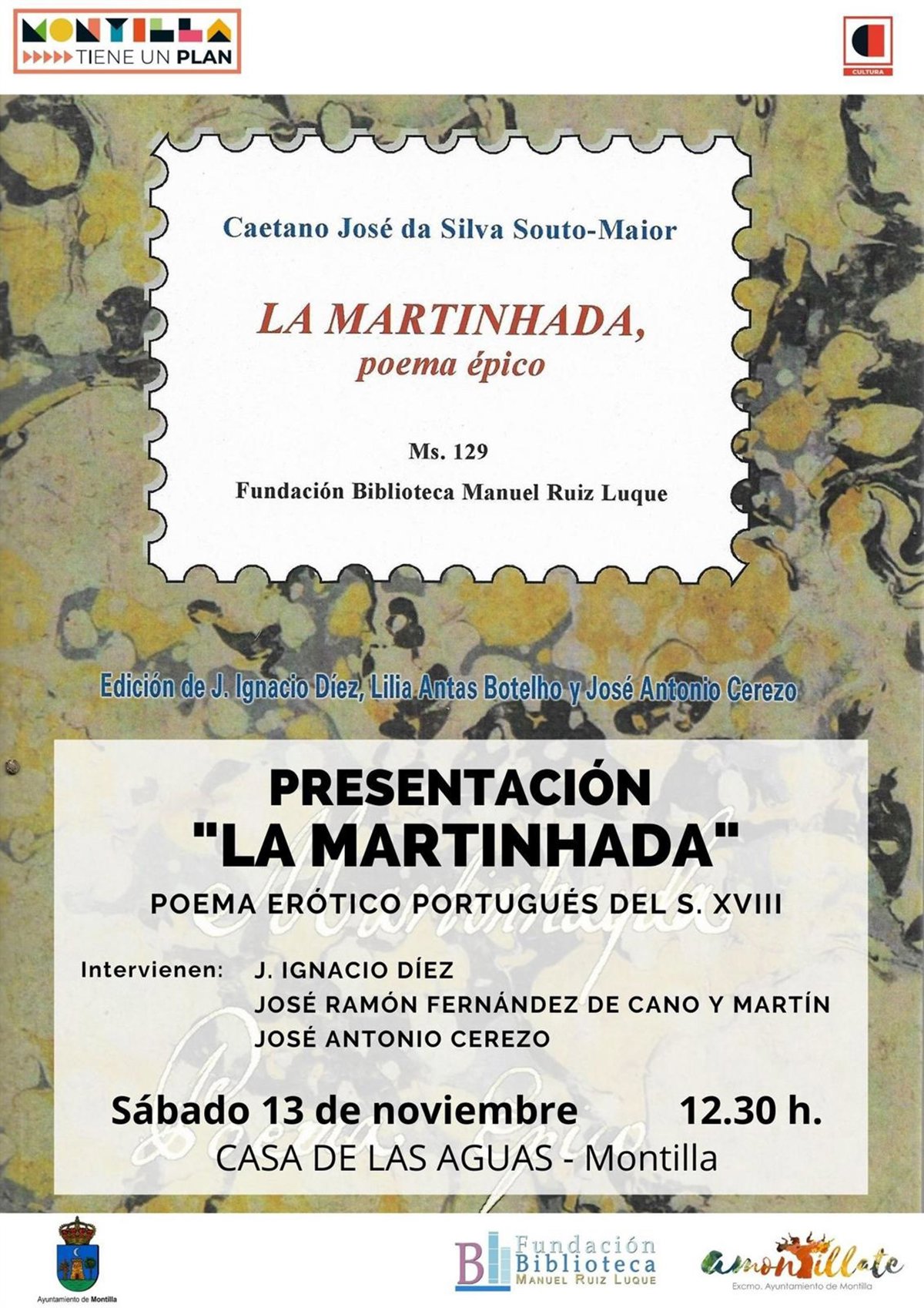 Cartel de la presentación del libro de Caetano José da Silva Souto-Maior (1694-1739), 'La Martinhada. Poema épico', publicado por el montillano Manuel Ruiz Luque (Bibliofilia Montillana). - AYUNTAMIENTO DE MONTILLA