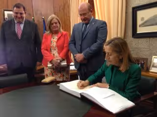 El alcalde de Jaén, Javier Márquez (PP), junto con otras autoridades, ha recibido este sábado a la presidenta del Congreso de los Diputados, Ana Pastor, quien ha firmado en el libro de Honor del Ayuntamiento.