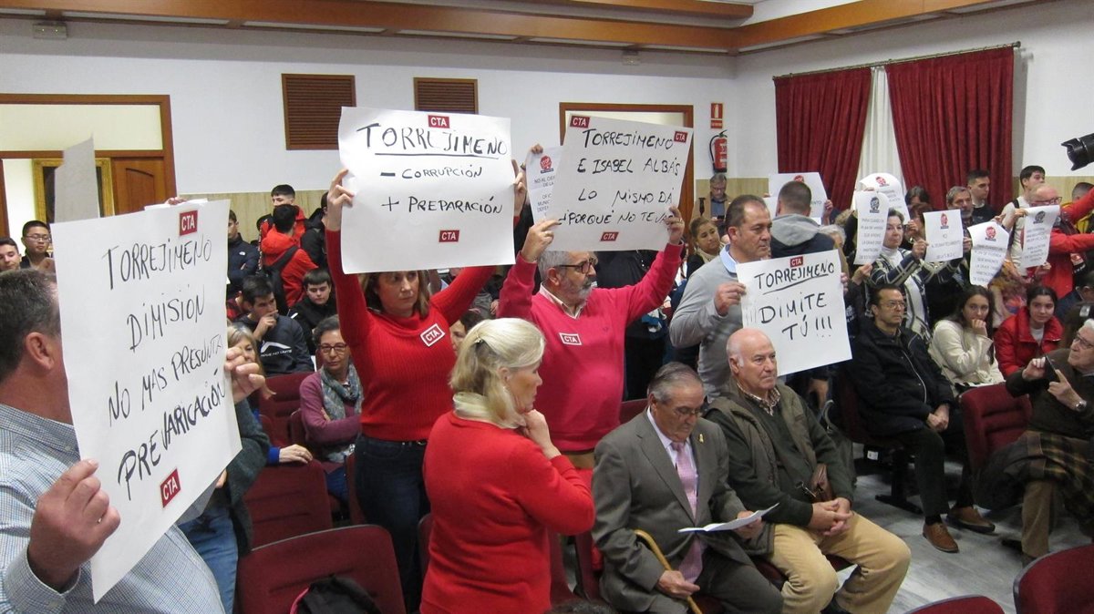 Representantes de CTA portan pancartas pidiendo la dimisión de Manuel Torrejimeno, en el salón de plenos. - EUROPA PRESS