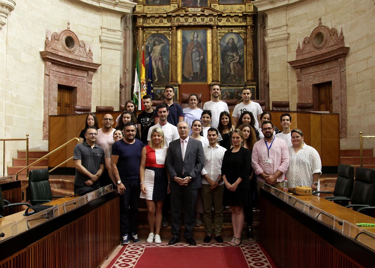 El presidente del Parlamento de Andalucía, Juan Pablo Durán, ha recibido este marte, en la sede del antiguo Hospital de las Cinco Llagas, a un grupo de jóvenes europeos del Erasmus + que participan en el proyecto Move In the Next European Youth Strategy, MINE, con la temática específica del reto de los Europeos ante la Migración.