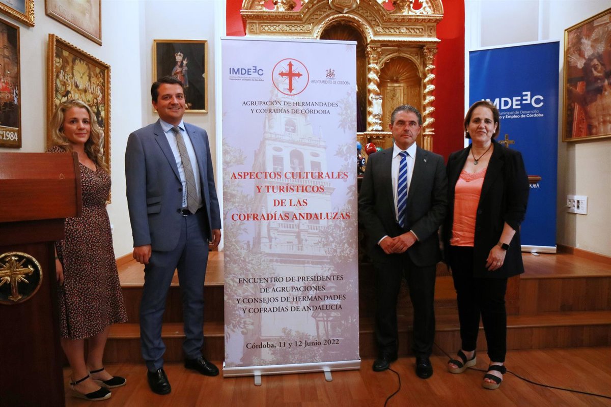 Sarai Herrera, José María Bellido, Manuel Murillo y Blanca Torrent en la presentación del encuentro de agrupaciones de hermandades y cofradías de Andalucía. - AYUNTAMIENTO DE CÓRDOBA