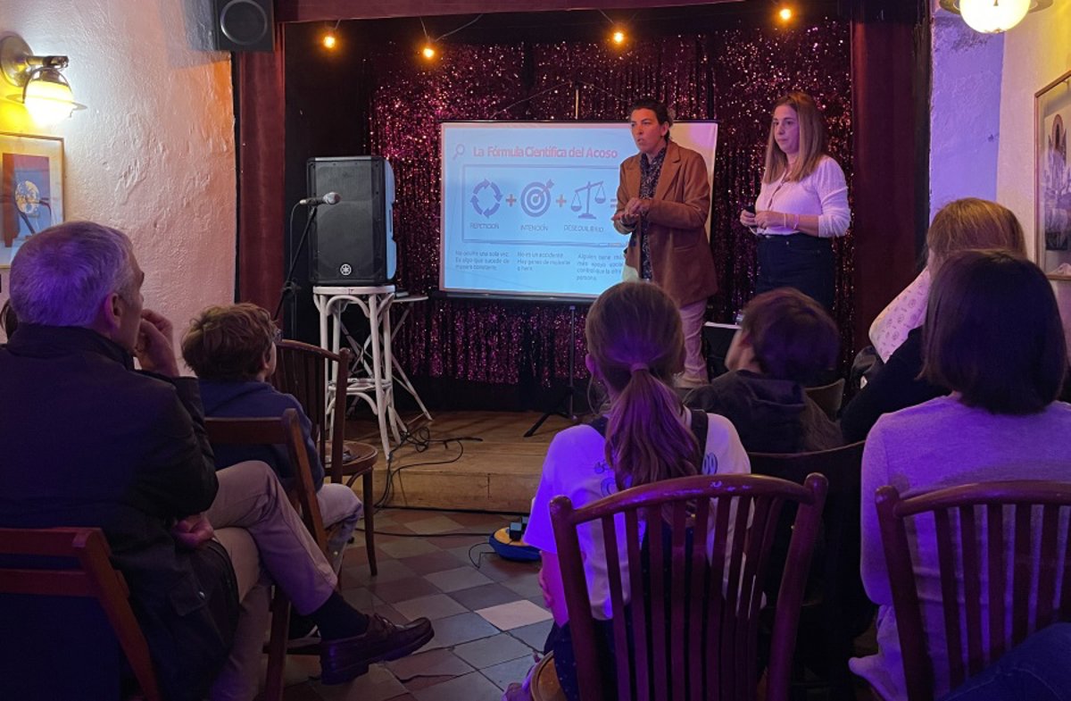 Ellas han sido las encargadas de acercar al público la realidad del acoso escolar y cómo se produce el acercamiento a este fenómeno a través de las ciencias sociales, mediante una metodología científica basada en el estudio del comportamiento humano a través de la observación, las entrevistas o el análisis. A lo largo de su charla, han explicado que el acoso escolar "sigue incluso una fórmula científica en la que participan tres componentes: la repetición, la intención y el desequilibrio".