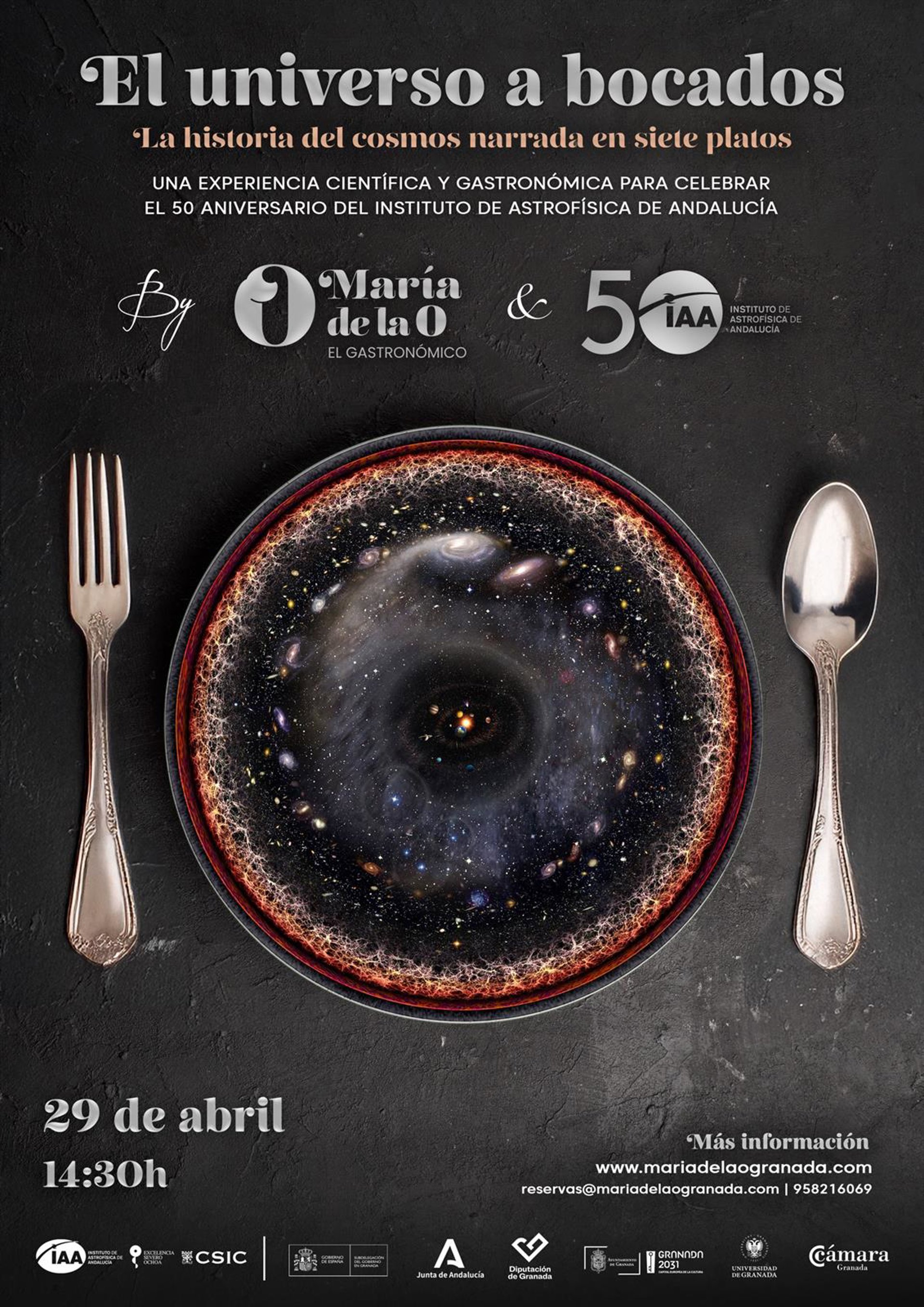 El restaurante María de la O acoge el 29 de abril 'El universo a bocados', una experiencia científica y gastronómica en la que los comensales conocerán de primera mano la historia del cosmos contada en siete platos en el marco del 50 aniversario del Instituto de Astrofísica de Andalucía (IAA-CSIC).
