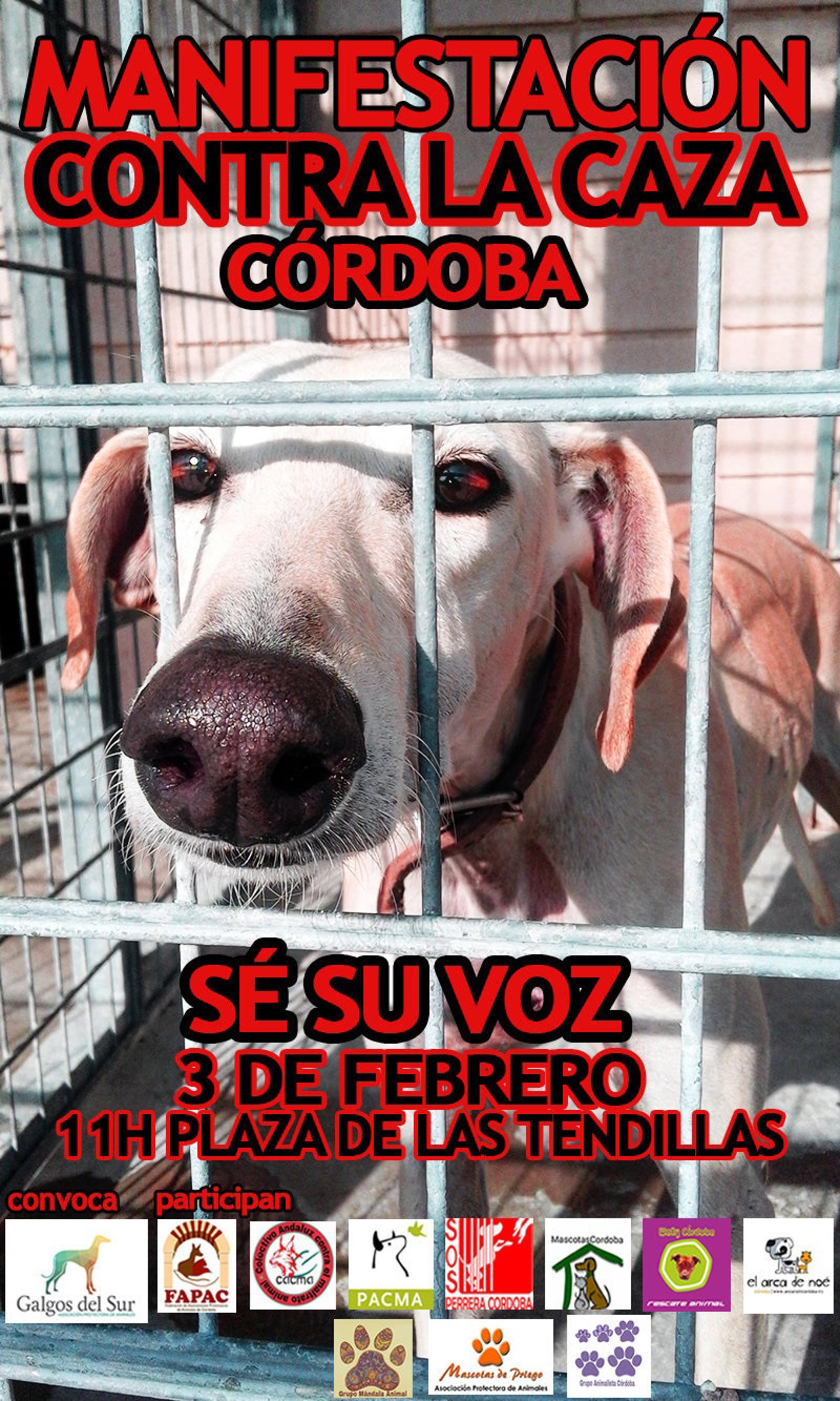 La Asociación Protectora de Animales Galgos del Sur, "con motivo del fin de la temporada de caza", ha convocado para este domingo la celebración en la capital cordobesa de una manifestación "en contra de la caza y el perjuicio que ocasiona al medio ambiente y nuestra fauna".