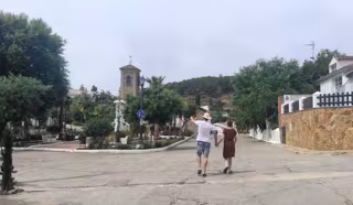 Dos turistas observan la plaza de la iglesia en la población de El Centenillo. - EUROPA PRESS
