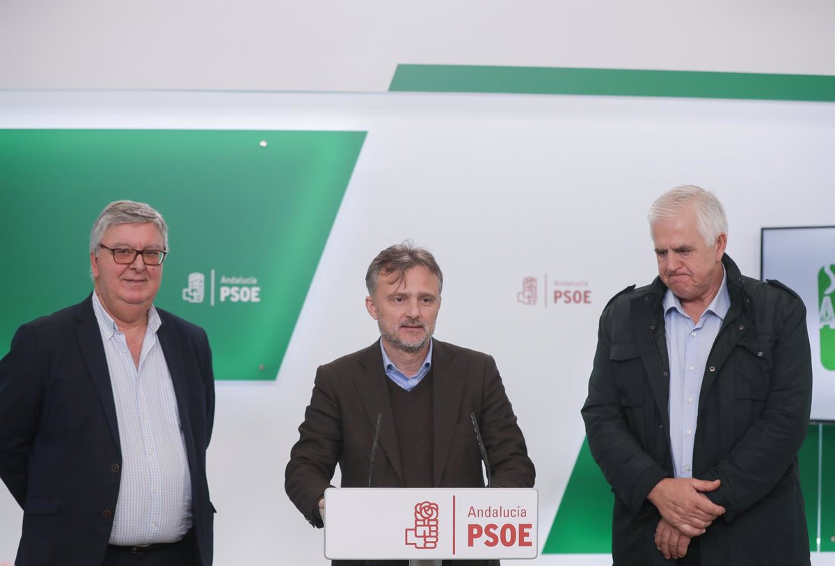 El portavoz del PSOE-A, José Fiscal (c) junto a el secretario general de COAG Andalucía, Miguel López (d) y el secretario general de UPA Andalucía, Miguel Cobos (i), atienden a los medios tras a reunión con el objetivo de analizar la situación actual de - María José López - Europa Press