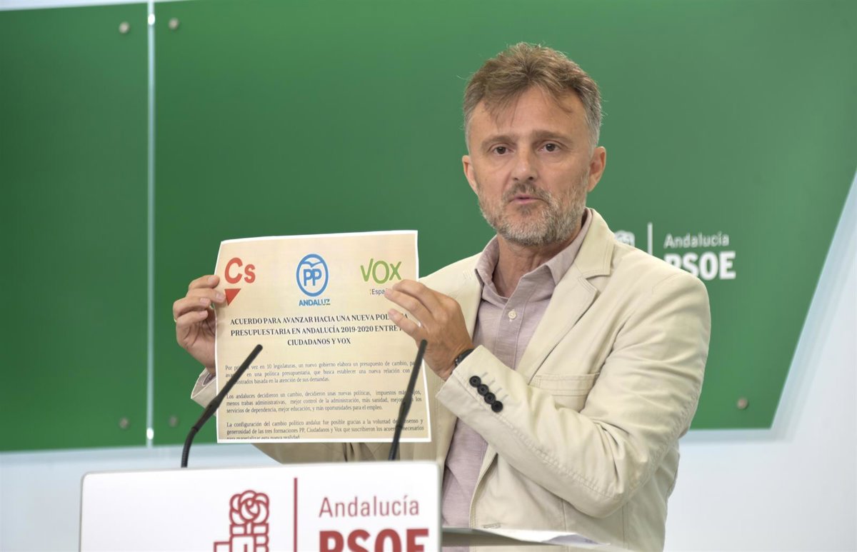 El PSOE-A ha acusado este martes al vicepresidente de la Junta y consejero de Turismo, Regeneración, Justicia y Administración Local, Juan Marín, de "tomar por tontos a los andaluces" al afirmar que su formación política, Ciudadanos (Cs), "no ha firmado todavía ningún acuerdo con Vox".