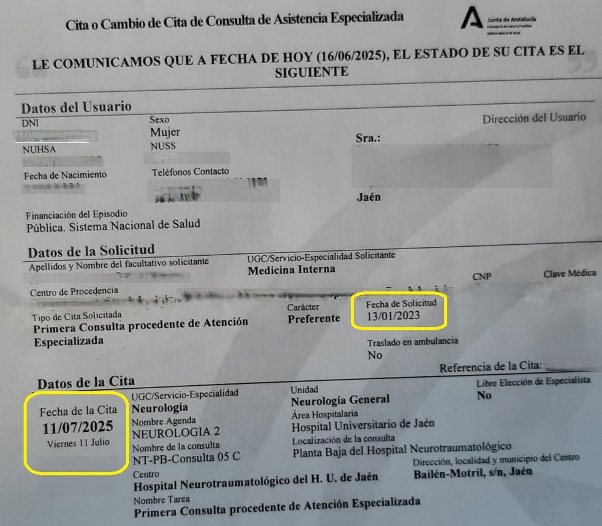 El PSOE ha denunciado que la Junta de Andalucía está dando cita a 30 meses con el neurólogo en el Hospital de Jaén. El parlamentario socialista Jacinto Viedma ha señalado que "son plazos insoportables" para una especialidad que aborda patologías muy delicadas y que "no es de recibo que un paciente tenga que esperar dos años y medio para ser atendido".