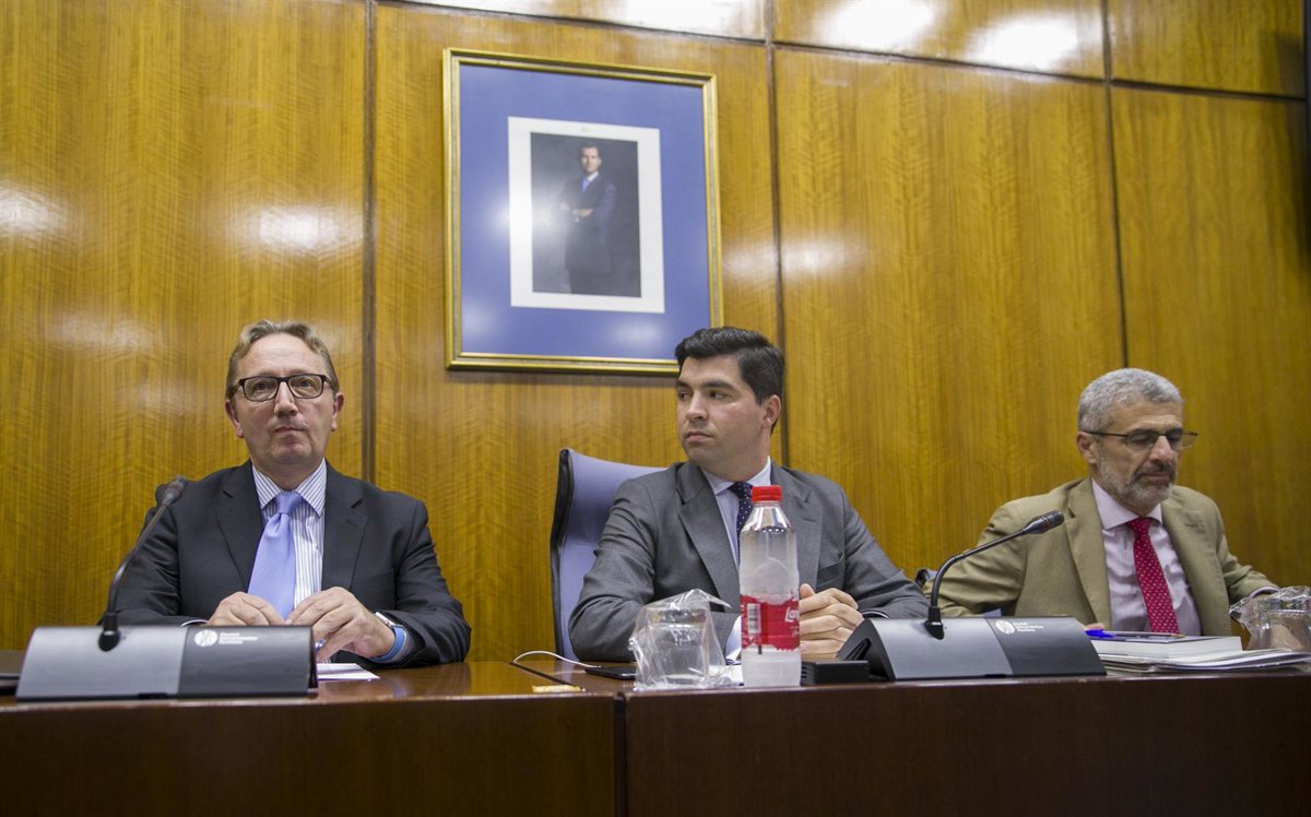 El exconsejero de Empleo Manuel Recio (i) junto al presidente de la comisión, Enrique Moreno (c) y el letrado al inicio de la comisión. En el Parlamento de Andalucía, Sevilla (Andalucía), a 21 de noviembre de 2019. - María José López - Europa Press