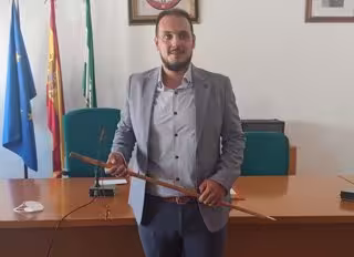 El socialista Rafael Ángel Moreno sostiene el bastón de mando, que le acredita como nuevo alcalde de Adamuz (Córdoba). - PSOE