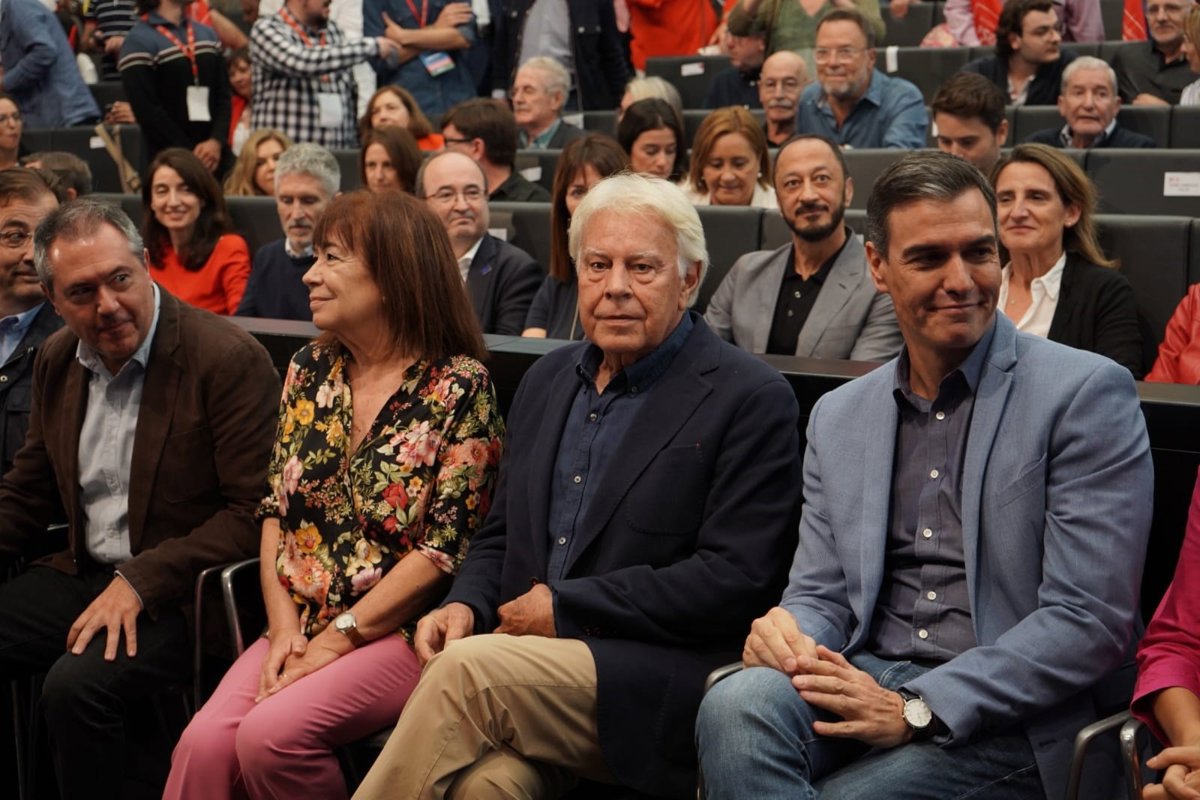 Felipe González ha ocupado un lugar preeminente en la primera fila del auditorio junto al actual secretario general del PSOE y presidente del Gobierno, Pedro Sánchez, y a los actuales máximos responsables del PSOE federal y del PSOE de Andalucía.