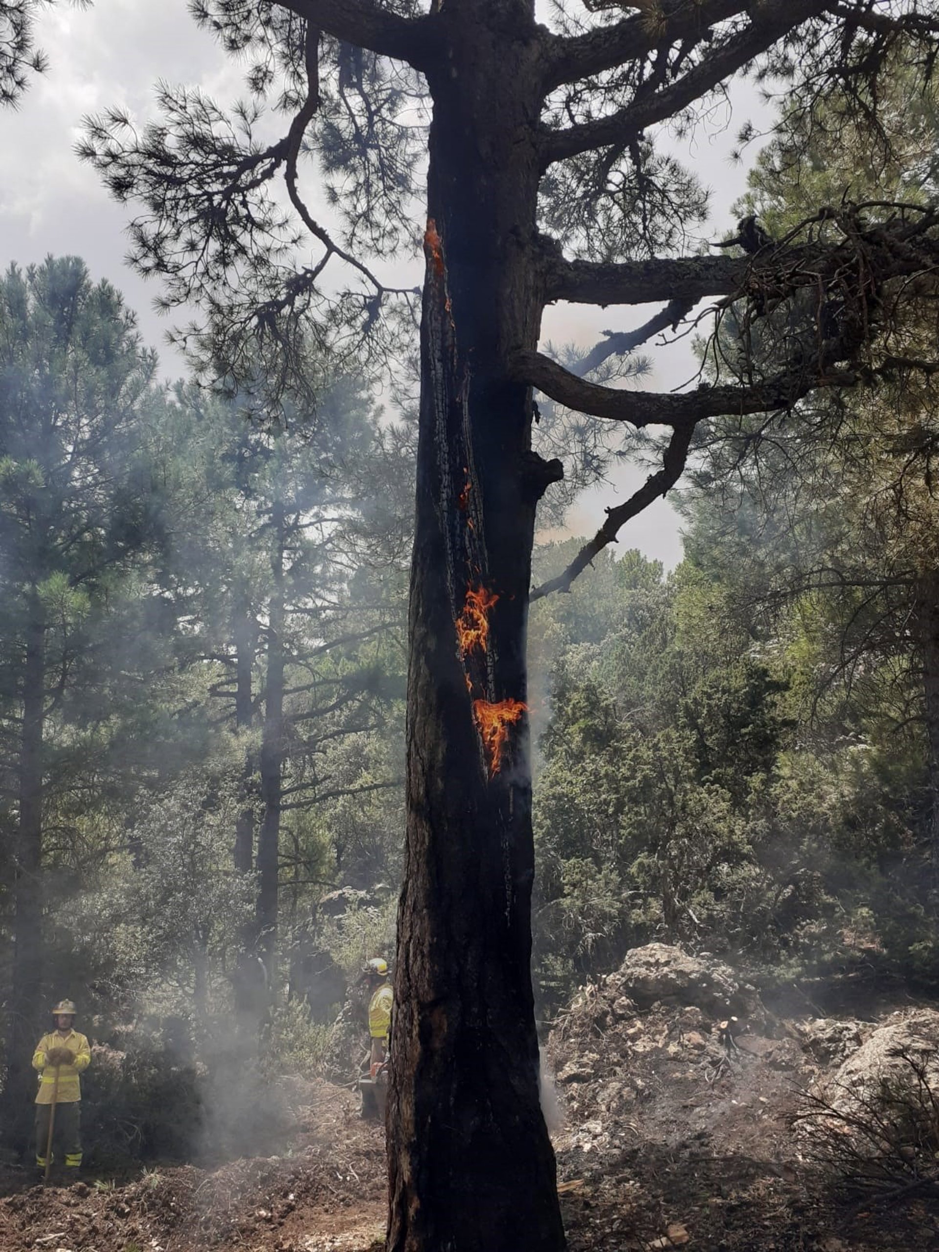 En este segundo fuego ha sido necesario talar el pino sobre el que cayó el rayo por encontrarse en combustión interna, tal y como se ha informado desde el Infoca.