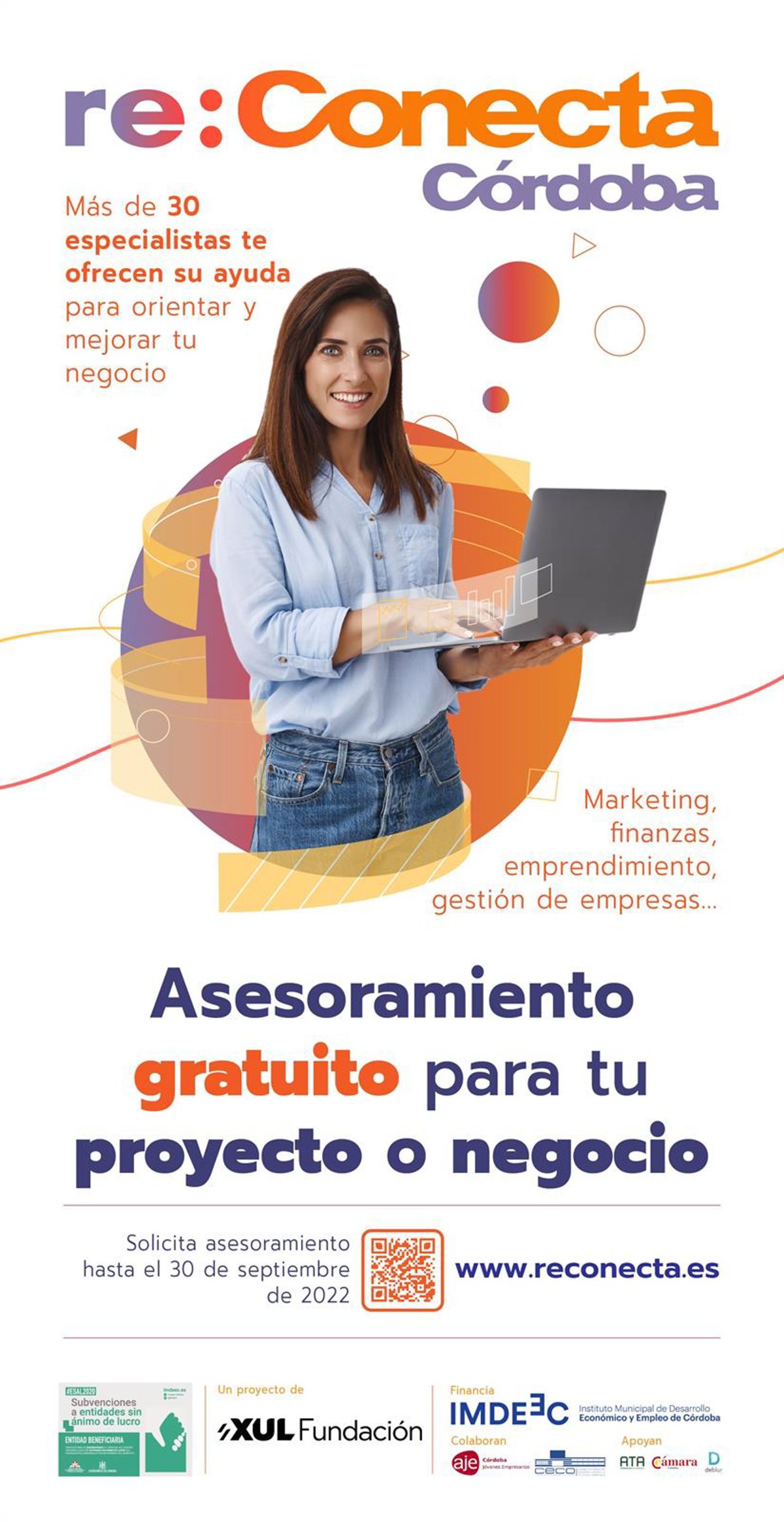 Por segundo año consecutivo, 're:Conecta Córdoba', iniciativa desarrollada por la Fundación Xul, con la cofinanciación del Instituto Municipal de Desarrollo Económico y Empleo de Córdoba (Imdeec) y el apoyo de ATA Andalucía, vuelve a poner a disposición de empresas, autónomos, emprendedores y profesionales un servicio de asesoramiento gratuito y especializado en distintas áreas de conocimiento, y además en esta segunda edición el programa se amplía a toda la provincia.