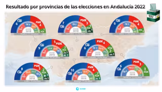 El PP gana las elecciones autonómicas en Andalucía y consigue 58 escaños, 32 más que los 26 parlamentarios obtenidos en los comicios de 2018 y supera en dos escaños la mayoría absoluta, fijada en 55 escaños. Por su parte, el PSOE consigue 30 diputados, tres menos que los 33 obtenidos en las pasadas elecciones autonómicas; mientras que Vox se convierte en tercera fuerza y obtiene 14 escaños frente a los 12 de hace tres años y medio.