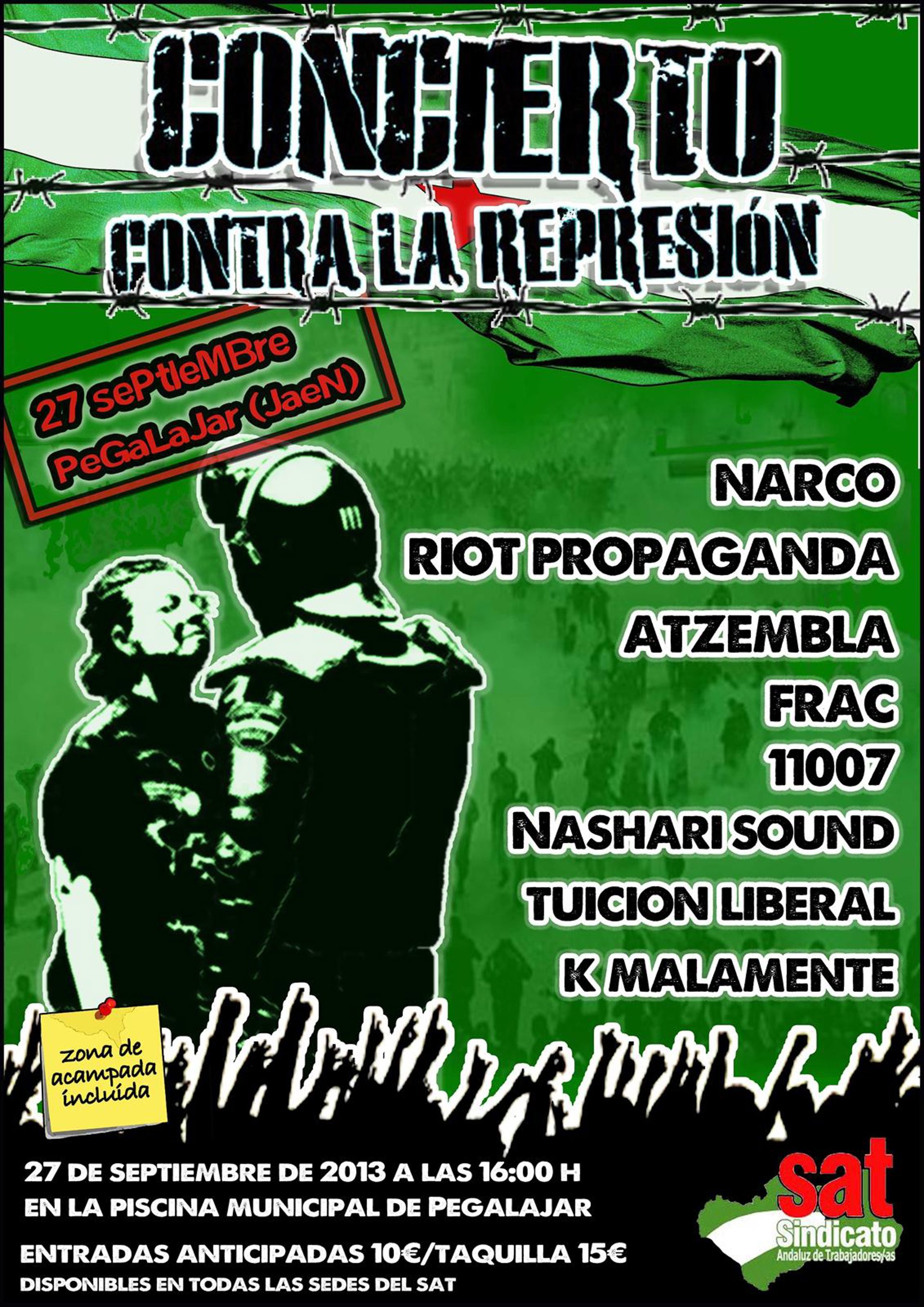 Las entradas podrán adquirirse en las sedes del SAT "de toda Andalucía", costarán diez euros cada una si se compran de forma anticipada y 15 si se compran en taquilla, dinero que, en todo caso, "irá íntegramente destinado a combatir la represión".