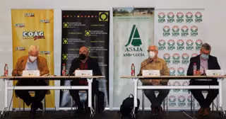 En rueda de prensa, el presidente de Asaja-A, Ricardo Serra; el secretario general de COAG-A, Miguel López; el secretario general de UPA-A, Miguel Cobos, y el presidente de Cooperativas Agro-alimentarias de Andalucía, Juan Rafael Leal, han señalado que están a la espera de que las condicione sanitarias lo permitan para organizar una gran movilización de todo el sector a nivel regional.